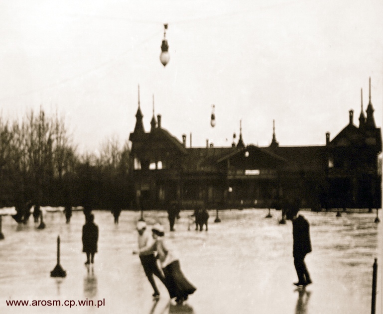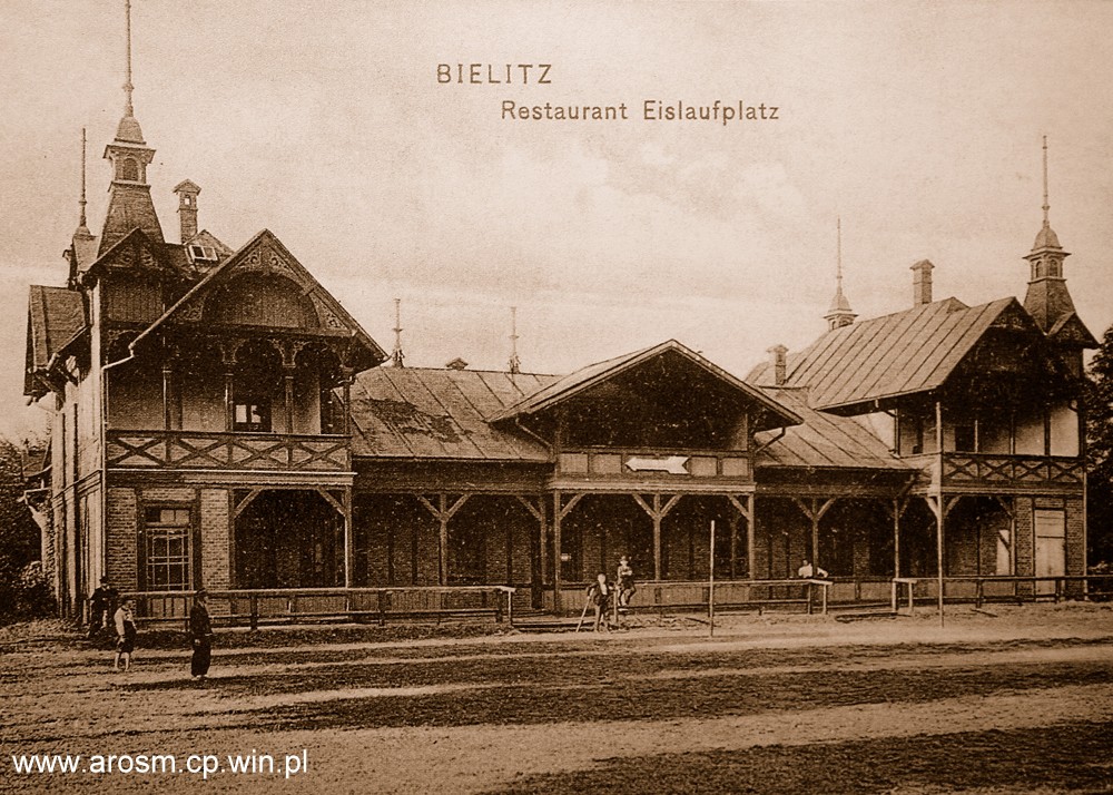 W 1892 r. założono Bielsko-Bialskie Towarzystwo Łyżwiarskie propagujące ten popularny sport. Wraz z przekształceniem terenów przy ul. Blichowej na park zbudowano nowe lodowisko z widocznym na zdjęciu drewnianym, stylowym budynkiem mieszczącym restaurację (w 1914 r. prowadził ją Robert Snatschka). Po 1928 r. Towarzystwo zbudowało nowy modernistyczno-funkcjonalistyczny pawilon o niskiej wartości artystycznej, jednakże na tyle funkcjonalny, że stary budynek, już zupełnie niepotrzebny, uległ rozbiórce.