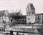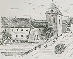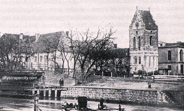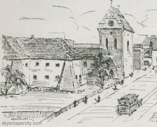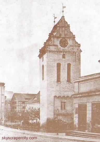 Widoczna na zdjęciu i rysunku wieża kościoła wraz z zabudowaniami klasztoru, zostały rozebrane w związku z rozbudową teatru, pod koniec XIX wieku.