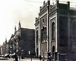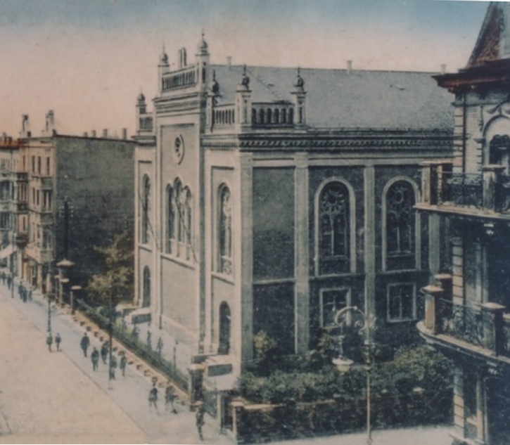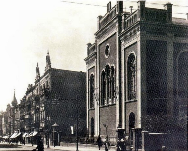 Dnia 23 września 1875 roku w Królewskiej Hucie przy Kaiserstrasse (głównej ulicy w mieście - dziś ulica Wolności) w obecności rabinów m.in. z Katowic, Bytomia i Rybnika otwarto zbudowaną w stylu mauretańsko-wschodnioarabskim synagogę, której pierwszym rabinem w latach 1890-1924 został dr Salomon Goldschmidt. Sąsiednia ulica (dziś Dworcowa) nosiła nazwę Synagogenstrasse. Synagogę wzniesiono według projektu mistrza budowlanego Banno Grötschela, wzorowanego na projekcie synagogi z Wiednia-Leopoldstadt. Wewnątrz świątyni znajdowała się obszerna sala modlitewna do której wchodziło się przez przedsionek. Całą salę z trzech stron otaczały galerie dla kobiet wsparte na zdobionych słupach. Jesienią 1939 roku hitlerowcy spalili synagogę, a rok później jej zgliszcza zostały rozebrane przez zmuszonych do tego okolicznych Żydów. Po zakończeniu wojny budynku synagogi nie odbudowano, na terenie po niej urządzono parking dla służbowych limuzyn, a następnie bazar.