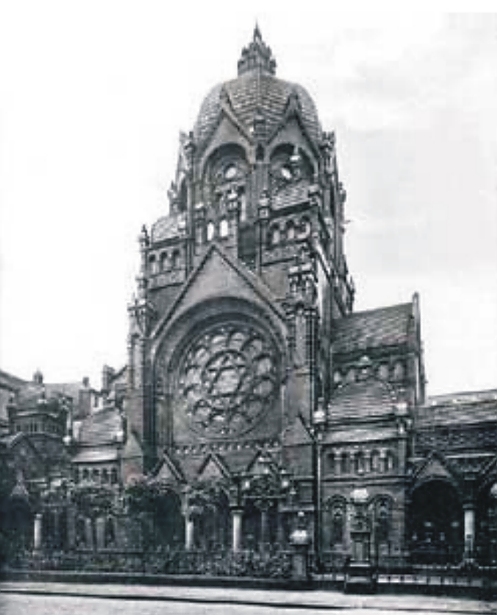 Eklektyczna synagoga, wybudowana przez Hansa Abessera i Jürgena Krögera, uważana za jedną z najpiękniejszych w Cesarstwie. Część wieżowa liczyła 32 metry wysokości. Spalona w czasie nocy kryształowej, kilka tygodni później - rozebrana. W 55. rocznicę tego zdarzenia odsłonięto w jej miejscu pomnik oraz lapidarium, odtwarzające obrys jej murów.