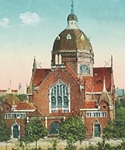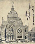 Murowany gmach synagogi wzniesiono na planie lekko zmodyfikowanego prostokąta, w stylu łączonego neogotyku, neorenesansu, eklektyzmu i stylu mauretańskiego. Architekt podczas projektowania synagogi najprawdopodobniej inspirował się głównie niemieckimi synagogami reformowanymi, m.in. Nową Synagogą w Berlinie czy synagogą w Bohum. Najbardziej charakterystycznym elementem synagogi była wielka kopuła o żebrowej konstrukcji, znajdująca się bezpośrednio nad główną salą modlitewną. Na jej szczycie umieszczona była latarnia. Kolejnym efektownym elementem były późnogotyckie ogromne okna ozdobione koronkowymi maswerkami oraz naczółki zwieńczone strzelistymi wieżyczkami. Wewnątrz przed główną salą znajdował się prostokątny przedsionek, w którym znajdowały się również szatnie, pokój zaślubin oraz kancelaria. Skrzydła przedsionka zwieńczone były kopułkami. Główna sala modlitewna mogła pomieścić około 1120 osób (670 miejsc dla mężczyzn i 450 dla kobiet).