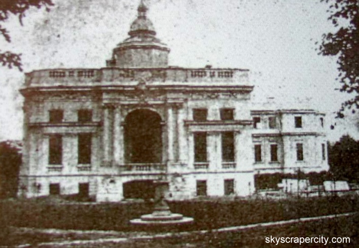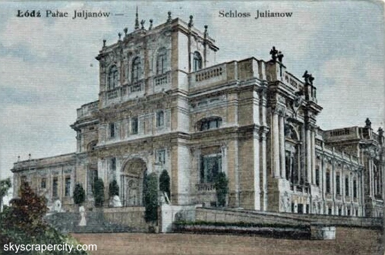 Pałac zbudowany na wzniesieniu (własność łódzkiego fabrykanta Juliusza Heinzla) inspirowany był formami włoskiego renesansu. Schody z tarasu rezydencji wiodły wprost do brzegu stawu. Między pałacem i stawem znajdowała się fontanna. Obok mieścił się zwierzyniec i sad. W czasie II wojny światowej w pałacu znajdowała się siedziba Armii Łódź. 6 września 1939 pałac został nieznacznie uszkodzony podczas bombardowania. Budowlę wyburzono w 1942 roku.
