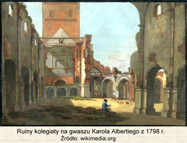 (za: wikipedia.pl) Wybudowany w XIII wieku kościół poddano znacznym przeróbkom budowlanym w 1388 i 1442 r. Odbudowany po pożarze (1447 r.) osobistym wkładem króla Kazimierza Jagiellończyka kościół oddano ponownie do użytku w roku 1470. Rok potem, 5 lipca 1471, nadano mu godność kolegiaty. Gotycki korpus świątyni przetrwał w niemal niezmienionym stanie do 3 czerwca 1773, kiedy to uderzenie pioruna wywołało pożar, który niemal doszczętnie strawił kolegiatę. Następnie podczas próby odbudowy, 18 września 1777 r., runęła jedna ze ścian. To co pozostało strawił kolejny pożar w 1780 r. Wówczas parafia farna przejęła kościół po kasowanym zakonie jezuitów, odstępując od remontu zrujnowanej kolegiaty. Resztki kościoła rozebrano w 1802 r.