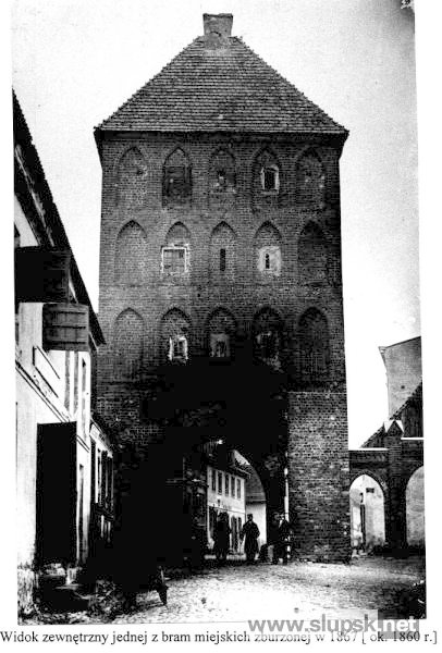 W 1325 roku dokument księcia Warcisława IV mówi, że miasto w tym czasie było już otoczone palisadą. Trwałe umocnienia w postaci murów zaczęto wznosić po 1325 roku. Ze względu na to, że w istniejących, drewnianych konstrukcjach obronnych bramy były miejscem najsłabszym i najbardziej narażonym na atak, w pierwszej kolejności wymurowano dolne partie trzech bram, jakie istniały w Słupsku. W drugim etapie podwyższono je o kolejne kondygnacje i wzniesiono mury od strony północnej, zachodniej i południowej. Jedną z nich była brama Ciesielska (zwana też Bramą Holstenów), która to budowla jednak, nie zachowała się do naszych czasów. Istnieją natomiast bramy: Młyńska oraz Nowa.