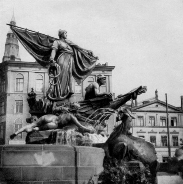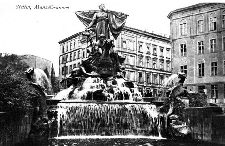 Kompozycja Sedina wykonana była wg projektu Karla Ludwika Manzla. Jej uroczyste odsłonięcie nastąpiło 23 września 1898 roku w obecności cesarza Wilhelma II. Została ufundowana przez społeczność miasta z okazji otwarcia nowej drogi wodnej na Odrze i portu wolnocłowego. Kompozycja odlana z brązu, przedstawiała stojącą postać kobiety - Sediny, symbolizującą Szczecin. Sedina, wsparta na kotwicy i trzymająca żagiel, miała być alegorią przyszłego rozwoju miasta, którego rozkwit wiązano z przemysłem i handlem morskim. Łódź, w której znajdowała się Sedina, kierowana była przez Merkurego i wodne bóstwa. Kompozycja umieszczona została na skale oblewanej wodą ze znajdującego się poniżej basenu.