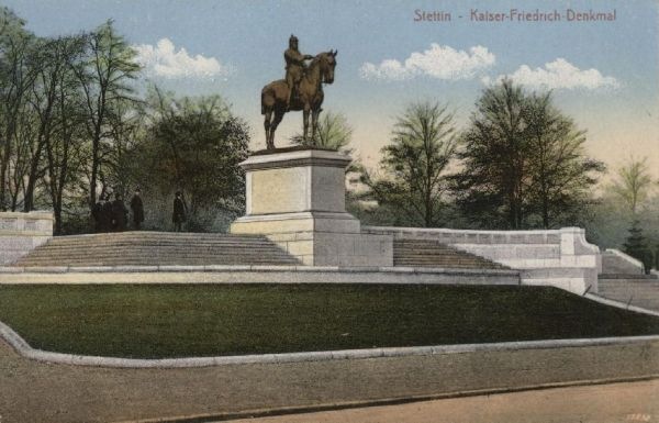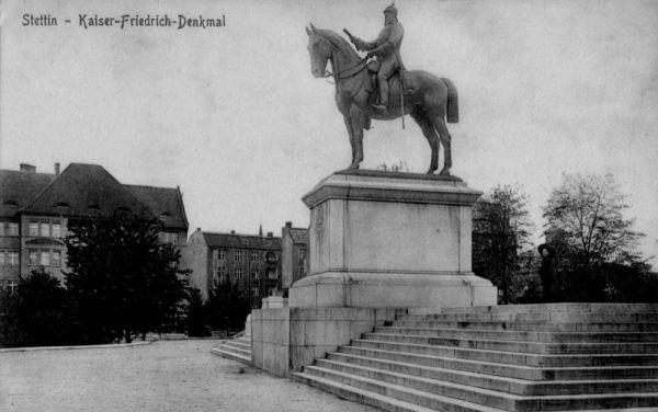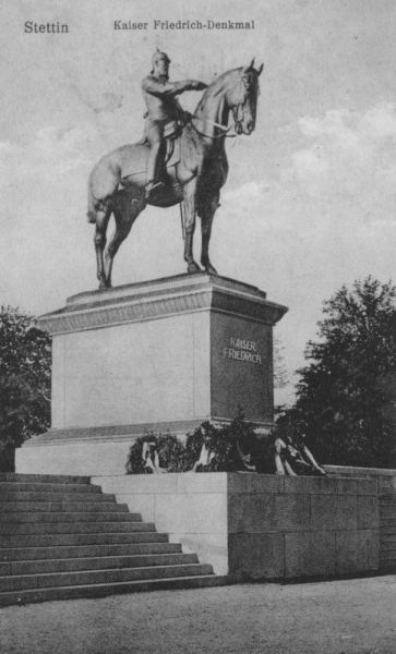 Pomnik cesarza Fryderyka III powstał pod koniec XIX lub na początku XX wieku i został stworzony przez Ludwiga Manzla. Pierwotne plany zakładały, że pomnik stanie na Wałach Chrobrego (Haken-Terasse) naprzeciwko gmachu Muzeum Miejskiego (Stadtmuseum), jednak okazało się, że powstały odlew jest zbyt duży na przygotowany wcześniej cokół. Zdecydowano się na postawienie pomnika kilkaset metrów dalej, na placu za muzeum, a na starym cokole pojawiła się rzeźba Heraklesa walczącego z centaurem z dolomitu.