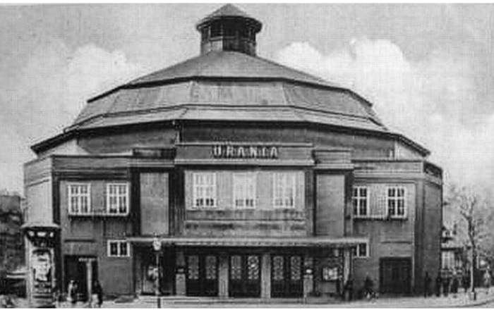 Kino "Urania" wzniesiono u zbiegu obecnych ulic Starzyńskiego i Zygmunta Starego (Behr-Negendankstraße 5) w 1914 r. Było to pierwsze kino publiczne powstałe ze współpracy 35 wzałożycieli. Organizowało projekcje o bardzo zróżnicowanym repertuarze wraz z występami oratorów. Budynek kina charakteryzował się okrągłą bryłą i małą wieżyczką na środku dachu.
