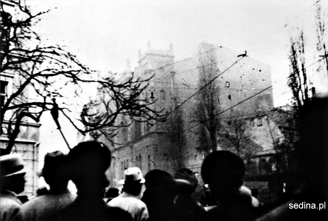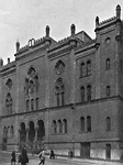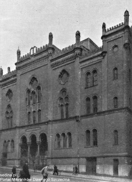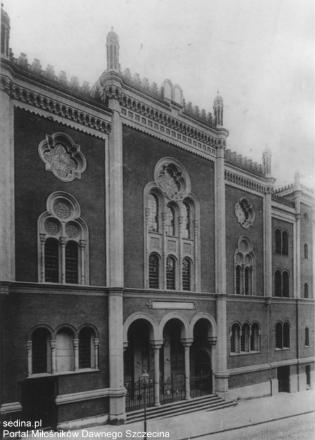 Na podstawie tekstu autorstwa Bruce'a: W 1812 r. król Fryderyk Wilhelm III cofnął zakaz osiedlania się Żydów w Szczecinie. W 1835 r. Gmina Żydowska kupiła od miasta działkę przy Grüne Schanze i wybudowała tam swój pierwszy, drewniany dom modlitewny. W 1863 r. Konrad Kruhl wykonał projekt nowej, murowanej Synagogi. Prace przy jej budowie zakończono w maju 1875 r. Mogła pomieścić ok. 1700 osób. W nocy 9/10 listopada 1938 r. budynek został podpalony przez hitlerowców, a Straż Pożarna ograniczyła swoje działania do polewania sąsiednich domów. Wypalone mury Synagogi stały jeszcze przez trzy lata, a następnie zostały wysadzone.