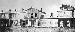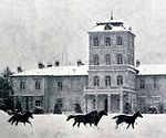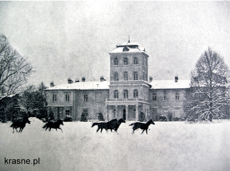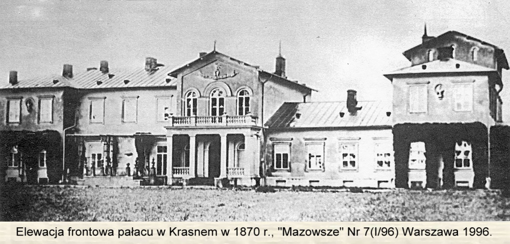 Gniazdo rodowe Krasińskich (od XIII w.). Widoczny na zdjęciach pałac wzniesiono w II poł. XIX w. na miejscu wcześniejszego, XVII-wiecznego obiektu. Rezydencję zaprojektowali: Zugmunt Rospendowski i Adolf Schimmelpfennig. W szczycie, nad wejściem głównym zdajdował się herb z dewizą rodową a na ryzalitach bocznych - popiersia Stefana Czarnieckiego, Stanisława Koniecpolskiego, Pawła Sapiehy, Jana Zamoyskiego i Stanisława Żółkiewskiego. Pałac rozebrano na początku II Wojny Światowej, po zaanektowaniu majątku przez Ericha Kocha (gaulejtera i nadprezydenta Prus Wschodnich). W miejscu pałacu postawiono willę, którą wycofujący się Niemcy wysadzili w powietrze w 1945 r.