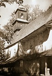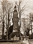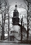 Drewniany, o konstrukcji zrębowej kościół parafialny zbudowano na miejscu wcześniejszego, na pocz. XVI w. a powiększono w 1690 r. (dobudowano zach. część prezbiterium). Prezbiterium nakryte było pozornym sklepieniem kolebkowym, nawa stropem. Od zach. przylegała kwadratowa wieża, o konstrukcji słupowej, z nadwieszoną izbicą, ścianach pobitych gontem, nakryta hełmem cebulastym z latarnią. Dookoła kościoła znajdowały się soboty, częściowo odkryte, częściowo szalowane tworzące kruchtę, składziki i przechodnią kaplicę (1795, odnowiona w 1825). Dachy kościoła kryte były gontem. Wyposażenie pochodziło głównie z XVII i XVIII w. Znajdowało się tu sanktuarium MB Szkaplerznej. Kościół został zniszczony w skutek pożaru. Udało się ocalić część wyposażenia: obraz z głównego ołtarza, stare ornaty, oraz dwie bądź trzy drewniane figury. Dziś w miejscu kościoła stoi bezstylowa świątynia z lat 70-tych XX w. Dawny kościół, poprzez swoją formę architektoniczną, należał do najbardziej oryginalnych świątyń drewnianych w Polsce.